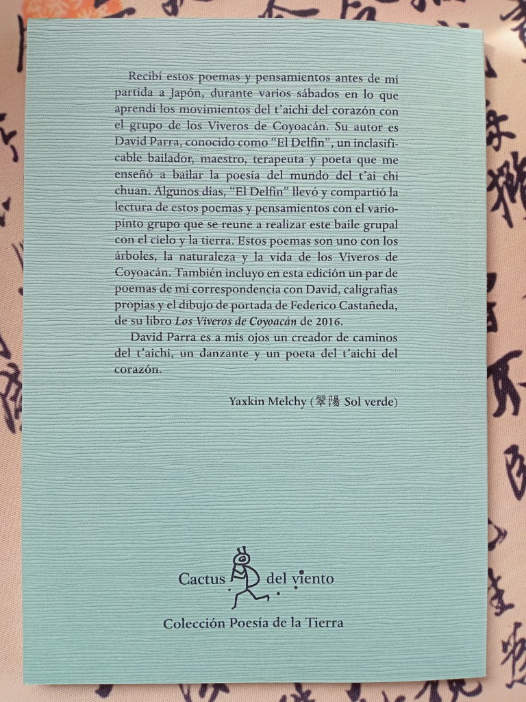 David Parra. Donde se crean las flores. La senda del T’aichi chuan de los Viveros. Selección por Yaxkin Melchy, Cactus del viento, 1ra edición, Ciudad de México y Tsukuba, Japón, 2022.
